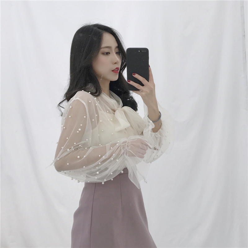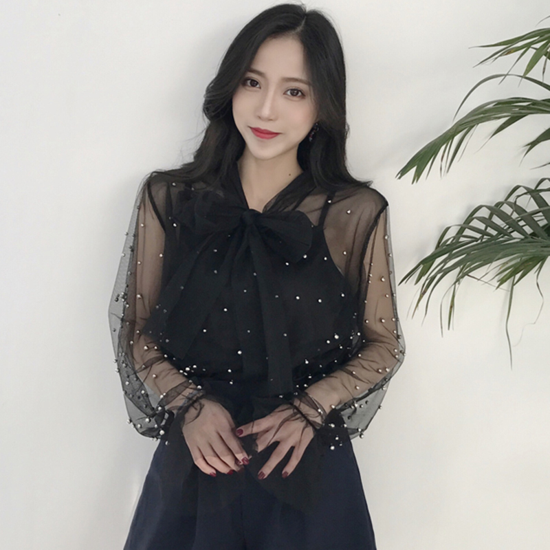 / 女士秋裝2018新款很仙的上衣網紗雪紡衫女襯衫背心蝴蝶結釘珠長袖