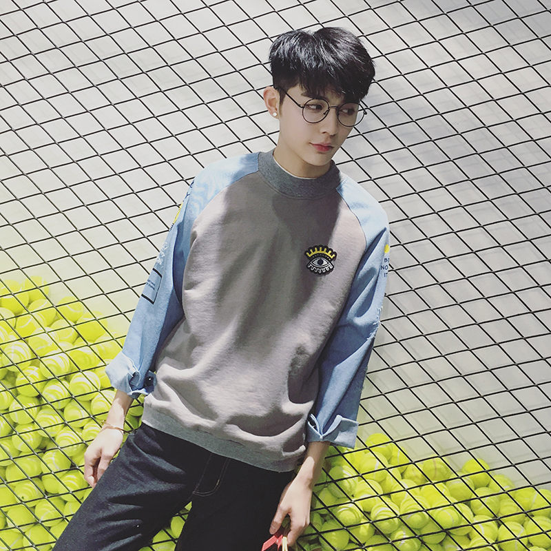 男裝牛仔拼接韓版寬松卡通男士衛衣插肩袖套頭衛衣