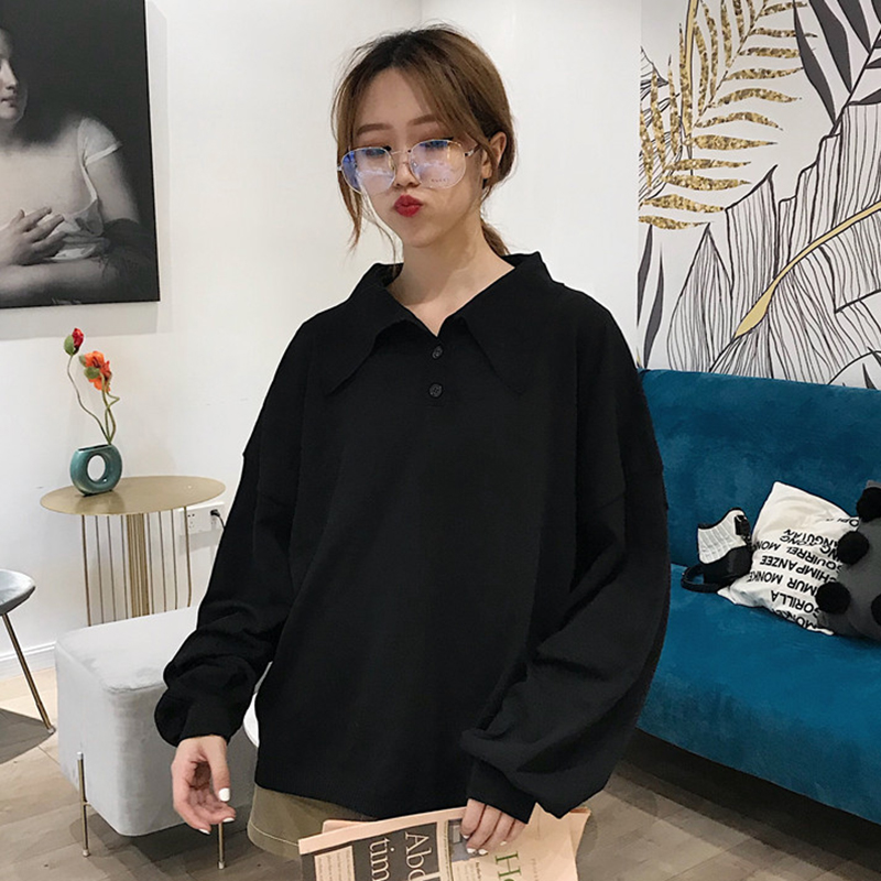 復古POLO領慵懶風針織衫女秋裝新款休閑黑色外套寬松燈籠長袖上衣