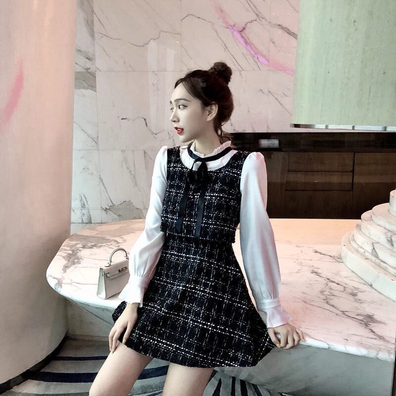 / 2018秋裝新款韓版顯瘦氣質小香風長袖假兩件裙子呢子套裝連衣裙潮