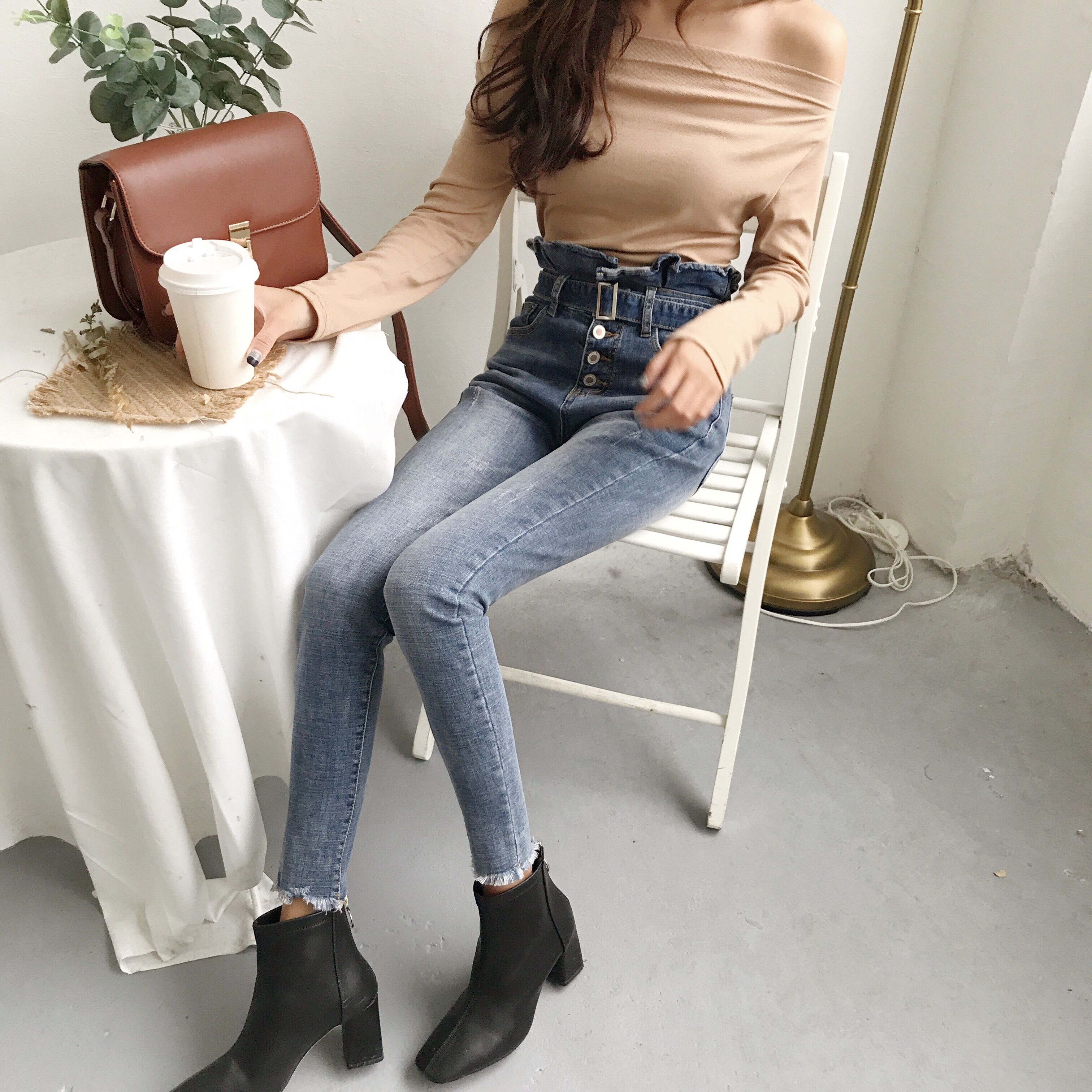 / 秋季荷葉邊彈力高腰氣質百搭牛仔褲女緊身小腳顯瘦韓版學生鉛筆褲