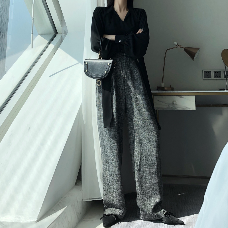 秋裝新款韓版慵懶風漏肩鎖骨上衣闊腿褲高腰復古直筒褲女時尚套裝