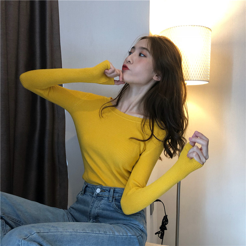 Chic簡約圓領修身長袖針織衫上衣女秋季純色復古百搭顯瘦打底衫潮