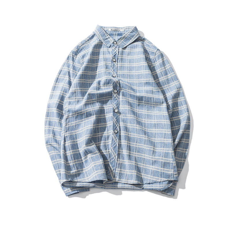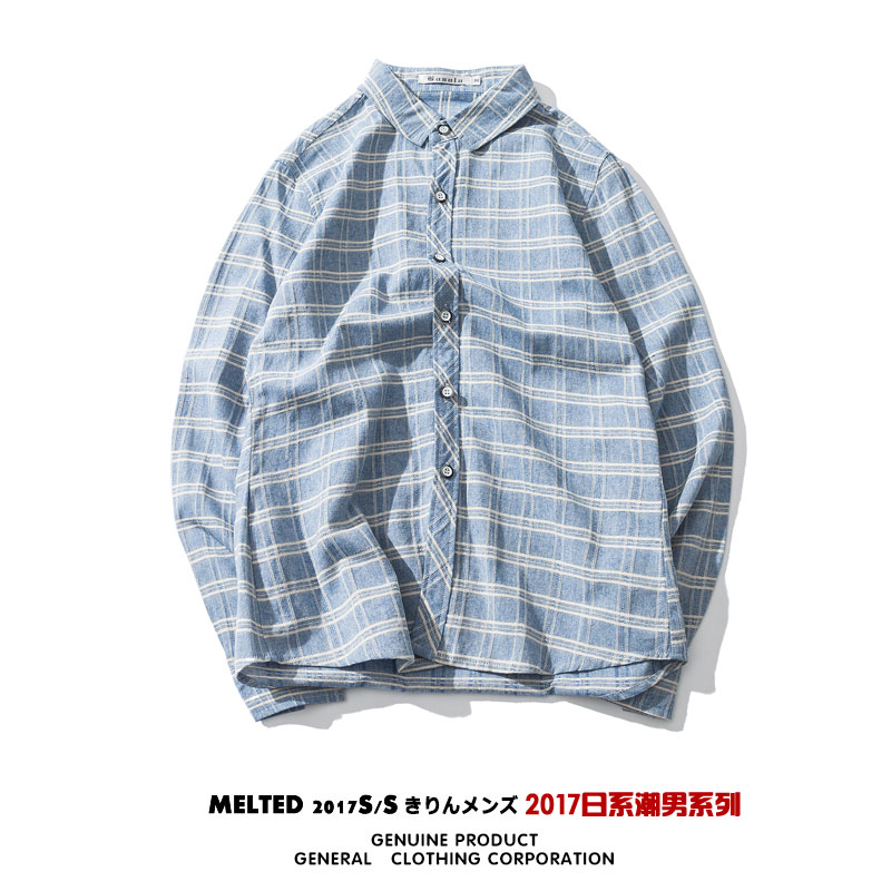 / 男裝日系復古彩格休閑男士長袖襯衫修身格子襯衣