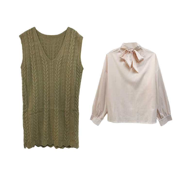 韓版套裝領口系帶百搭襯衫+V領無袖中長款針織背心裙連衣裙兩件套