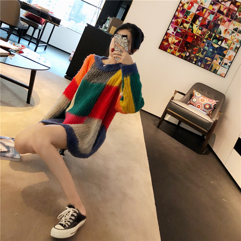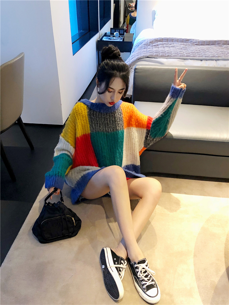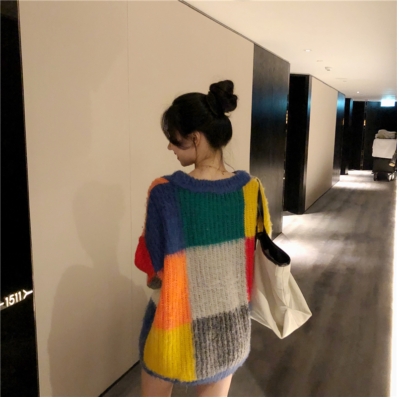 / chic慵懶風毛衣女套頭寬松加厚秋季拼接格子甜美小清新學生針織衫