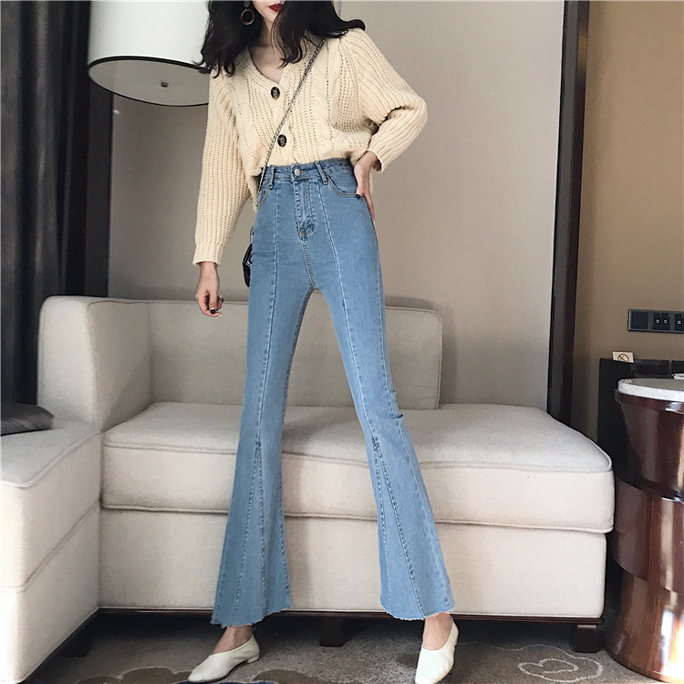 / 褲子女秋季新款韓版彈力高腰顯瘦修身拼接牛仔褲毛邊微喇叭牛仔褲