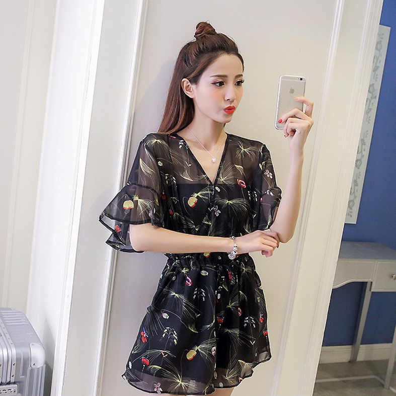 / 夏季新款寬松V領雪紡連體短褲復古名媛氣質碎花時尚連衣裙女