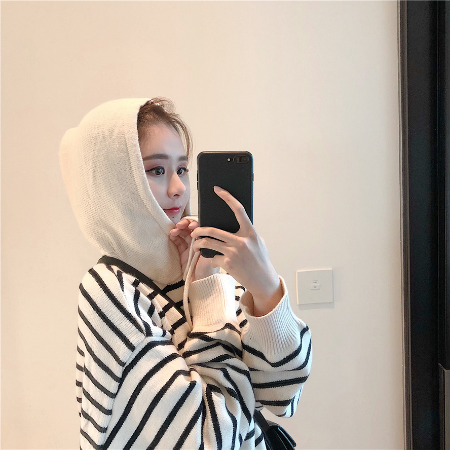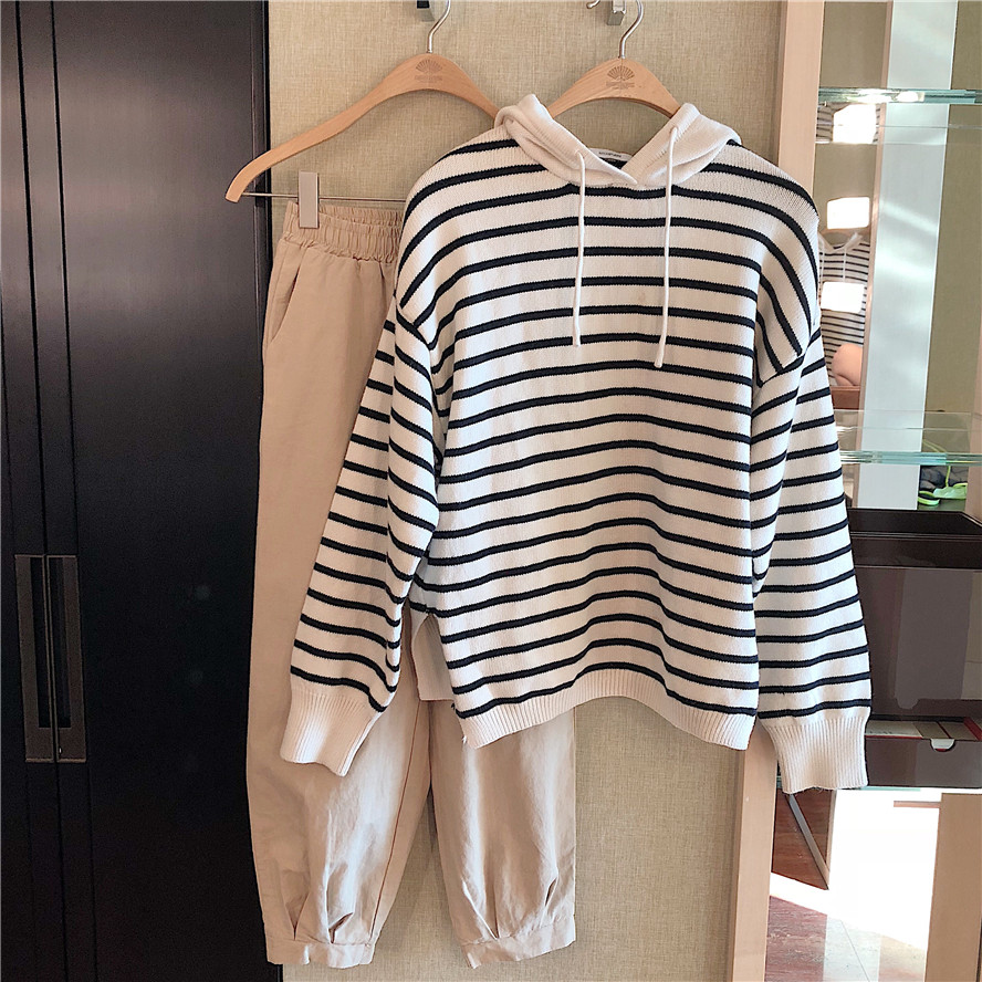 秋裝女2018新款軟糯連帽條紋毛衣女+慵懶風舒適闊腿褲(加厚版)