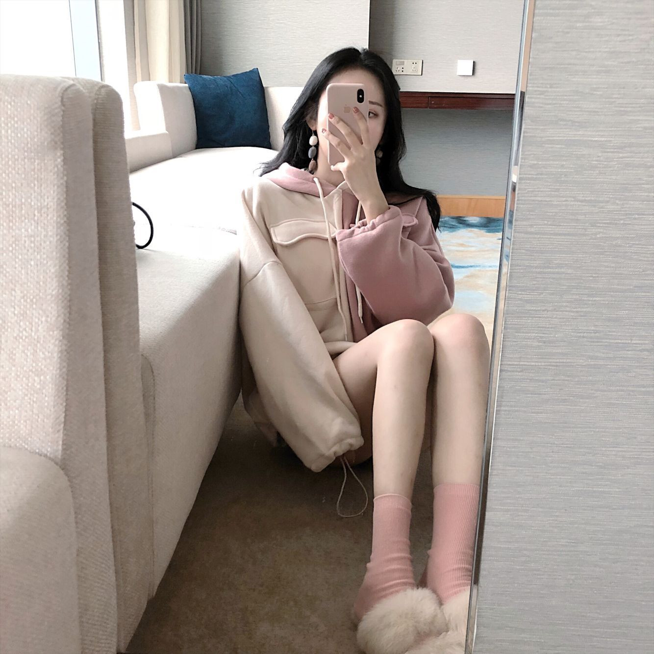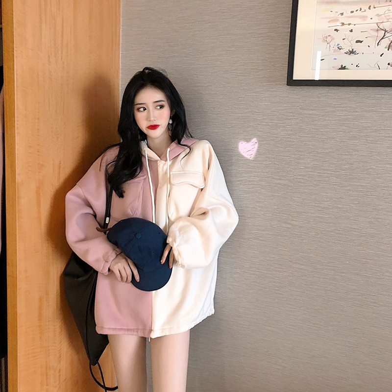 / 撞色拼接連帽個性口袋加絨加厚上衣女裝設計感秋季保暖抽繩衛衣潮